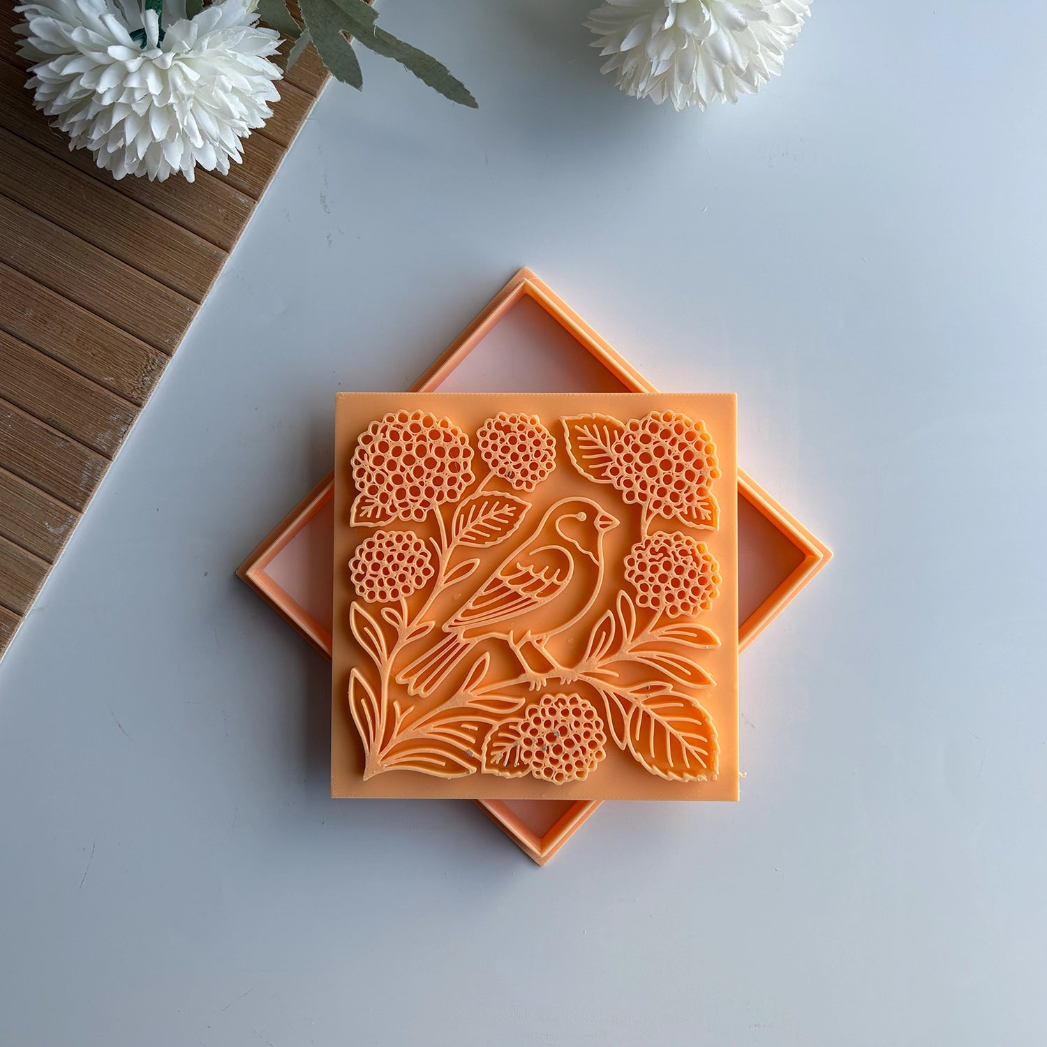This design moves beyond simple patterns to offer a true botanical relief. It features a delicate songbird perched amidst full, textured hydrangea clusters and broad leaves. The 10 cm (approx. 4 inches) size provides the perfect canvas for these intricate details, making it an ideal tool for creating statement coasters, decorative tiles, or elegant additions to hand-built vessels.